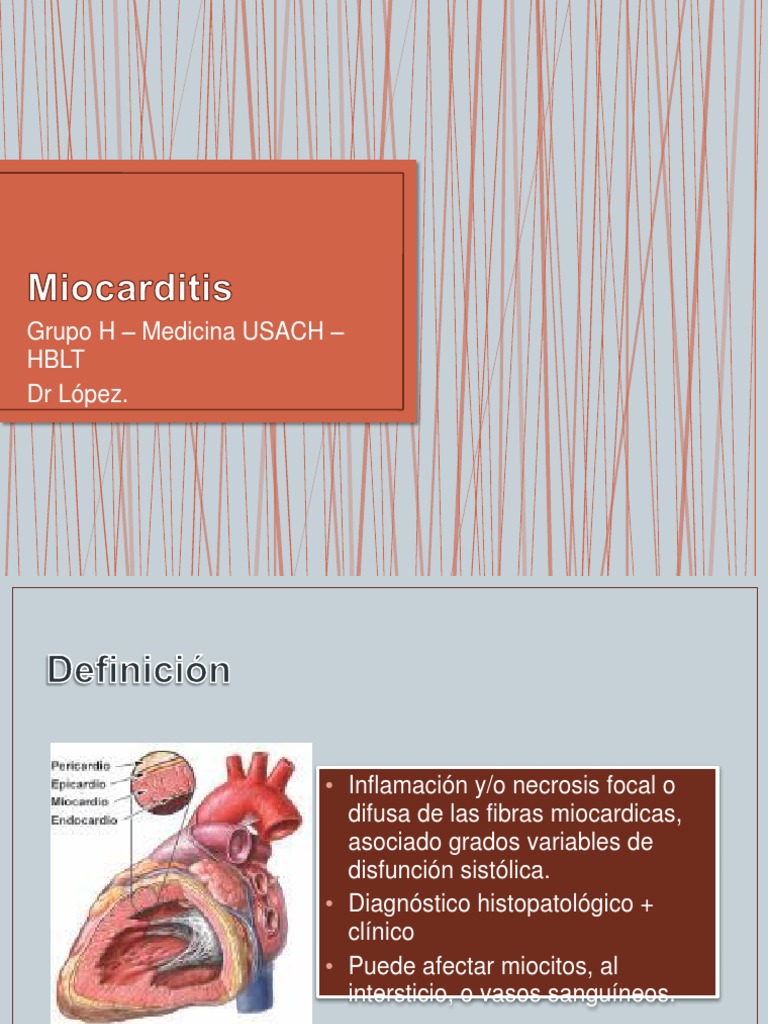L mandíbula, glutéus, olíva, bétula, umbilícus, glándula, pílula, ampúlla, flos, lóbus, línea, lambdoídeus, lóngus, plúmbum. Miocarditis miocarditisclasificación y recursos externos aviso médico imagen histológica de una imagen histológica de una miocarditis viral en un paciente con insuficiencia cardíaca congestiva. Malestar general fatigabilidad astenia taquicardia sinusal. De wikipedia, la enciclopedia libre. Myocarditis is inflammation of the heart muscle.